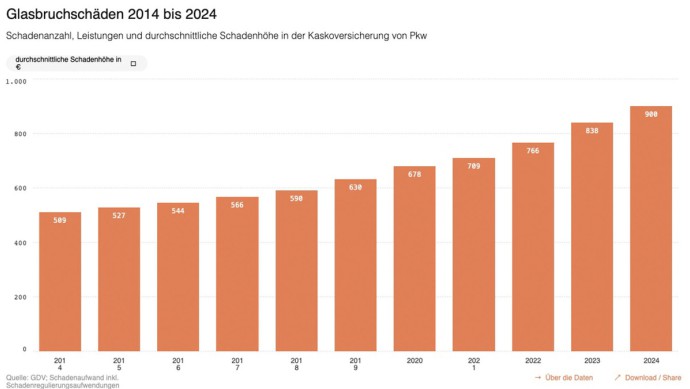 Die begleitende Grafik des GDV geht noch ein paar Jahre weiter zurück ins Jahr 2014. Daraus wird ersichtlich, dass der durchschnittliche Glasschaden in der Kraftfahrt-Versicherung von 509 Euro (2014) auf 900 Euro (2024) angestiegen ist. Das entspricht einer Teuerung um 77 Prozent innerhalb einer Dekade.