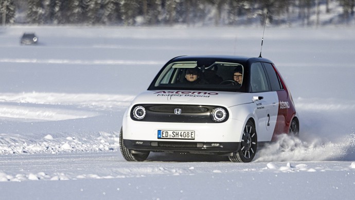 Wer zum ersten Mal auf dem Fahrersitz des modifizierten Honda-e Platz nimmt, greift unweigerlich ans Lenkrad. Um den elektrischen Kleinwagen zu steuern, reicht jedoch die rechte Hand. Der Fahrer umschließt damit ein kompaktes Bedienelement in der Mittelkonsole, das "New Input Device" (NID). Was in etwa so aussieht wie ein mit Alcantara überzogener Tankverschluss, soll nach über 130 Jahren das Lenkrad als Schnittstelle zwischen Mensch und Auto ablösen. Zumindest, wenn es nach Astemo geht. Im Rahmen eines Wintertests im nordschwedischen Arjeplog öffnete der japanische Zulieferer seine Teststrecke auf einem zugefrorenen See, um diese neue Art der Fahrzeugkontrolle erfahrbar zu machen.