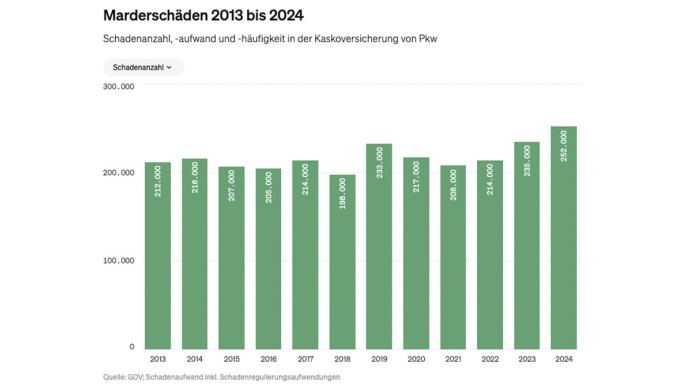 Im Jahr 2024 lag die Schadenhäufigkeit bei 6,1 Marderschäden pro 1.000 kaskoversicherten Pkw und damit rund 6,8 Prozent höher als im Jahr zuvor. Insgesamt registrierten die Versicherer rund 252.000 Schäden durch Marderbisse. Der Schadenaufwand lag bei rund 157 Millionen Euro. Im Durchschnitt kostete ein Marderschaden etwa 620 Euro.
