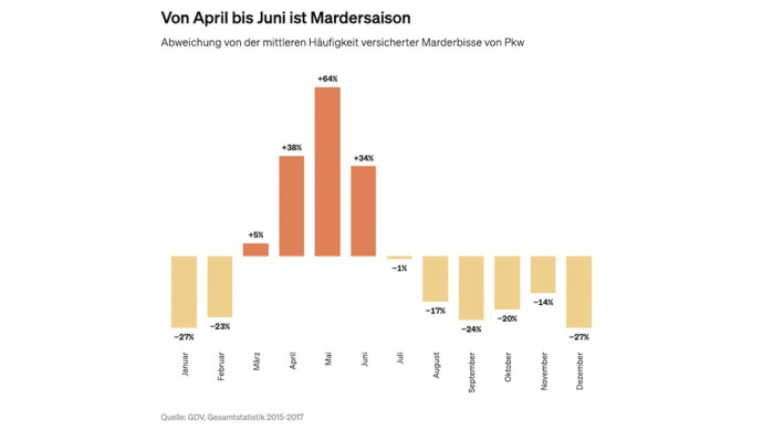 Im Frühjahr reagieren Marder besonders aggressiv auf die Duftmarken von Rivalen. Warme Motorräume dienen als Unterschlupf und Revier – mit fatalen Folgen: Parkt ein Auto abwechselnd in verschiedenen Revieren, werden die markierten Leitungen von konkurrierenden Tieren kurzerhand zerbissen. Die Schäden bleiben häufig zunächst unbemerkt. "Ein einzelner Biss kann ausreichen, um wichtige Fahrzeugfunktionen zu beeinträchtigen", so Asmussen. Werde eine beschädigte Leitung zu spät entdeckt, könne das Folgeschäden an Motor oder Elektronik verursachen.