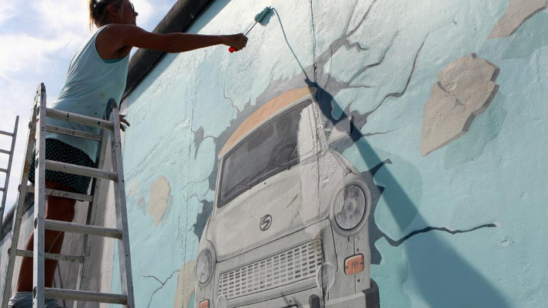 Ein Trabi für die Freiheit: Birgit Kinder bemalt einen Teil der Berliner Mauer.