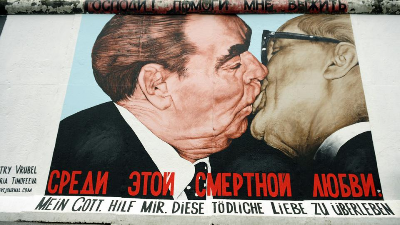 Eines der bekanntesten Kunstwerke der east Side Gallery: Der Bruderkuss zwischen Leonid Breschnew und Erich Honecker.