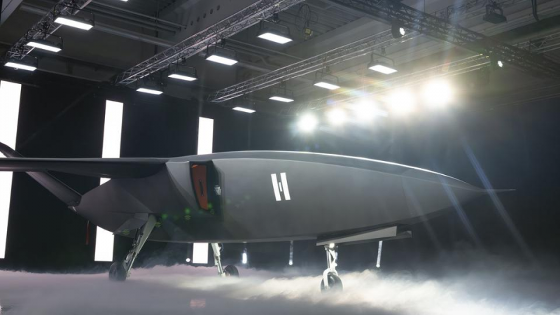 Wummernde Beats, Nebel auf dem Boden, dann öffnet sich eine Wand und gibt internationalen Journalisten den Blick frei auf den neuen Kampfjet CA1-Europa. Früher hinter verschlossenen Türen versteckt, inszeniert sich die Rüstungsindustrie nun und erinnert an ein Popkonzert. Da steht er nun: elf Meter lang, bis zu vier Tonnen schwer, unbemannt. Noch ist es eine Designstudie, 2027 soll er erstmals in die Luft gehen, in vier Jahren dann serienreif sein.