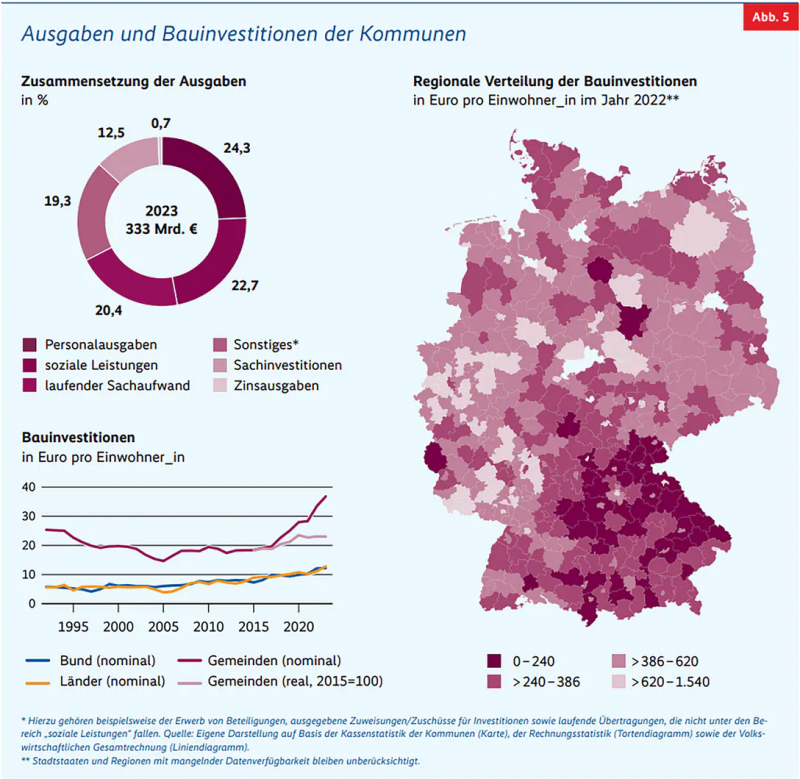 Auch bei den Bauinvestitionen zeigt sich ein deutliches Gefälle: 2023 tätigten die Kommunen zusammen 333 Milliarden Euro an Gesamtausgaben, aber nur 12,5 Prozent davon flossen in Sachinvestitionen – also in den Bau und die Sanierung von Straßen, Schulen, Kitas oder Verwaltungsgebäuden. Im Ergebnis sind die kommunalen Bauinvestitionen zwar nominal gestiegen, real – also preisbereinigt – stagniert die Bautätigkeit aber seit 2020.