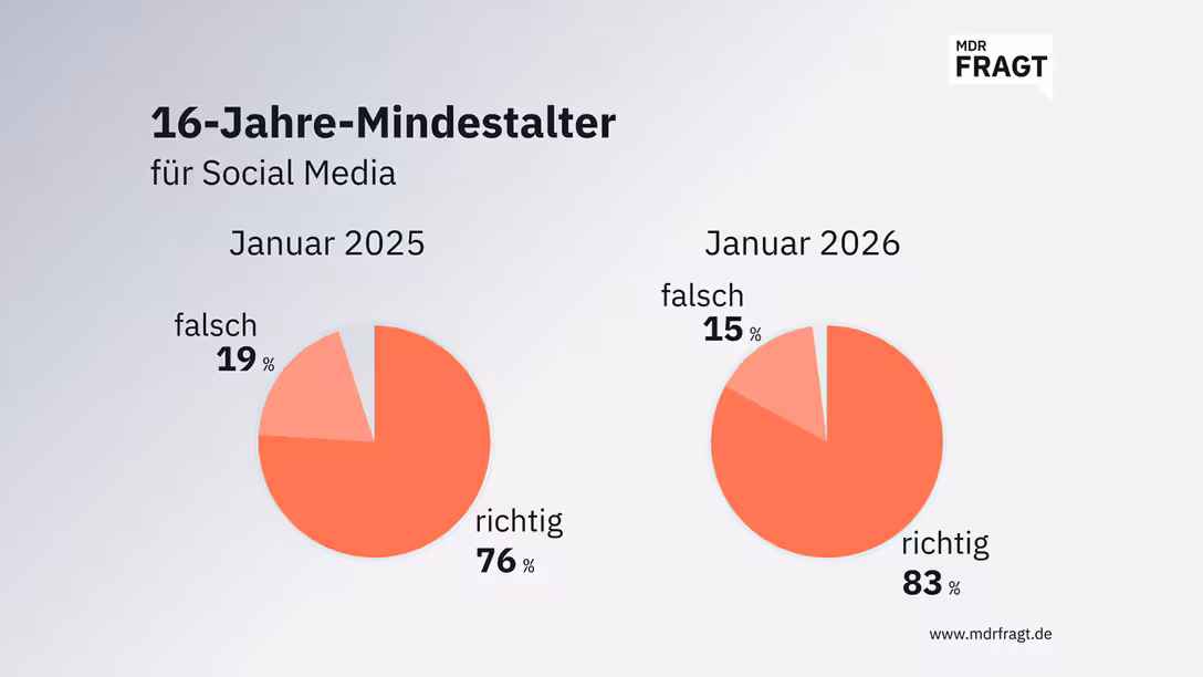 So wie Jan (49) aus Erfurt sehen es viele MDRfragt-Teilnehmende: "Ich finde es richtig, weil soziale Netzwerke nachweislich Einfluss auf Selbstbild, Konzentration und psychische Gesundheit haben und Kinder damit häufig überfordert sind." Katharina (58) aus dem Eichsfeld beobachtet: "Kinder können doch noch gar nicht Wichtiges von Unwichtigem filtern." An der Umfrage haben sich mehr als 19.000 Menschen aus Sachsen, Sachsen‑Anhalt und Thüringen beteiligt.
