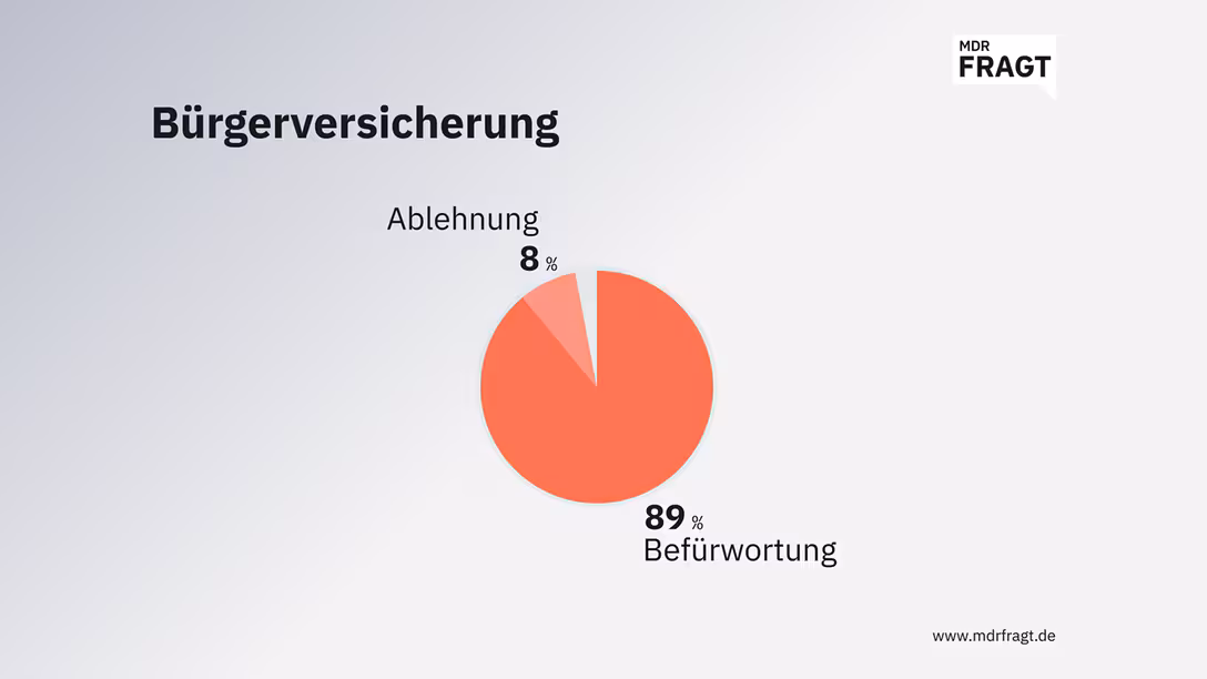 Bundesarbeitsministerin Bärbel Bas (SPD) forderte zuletzt eine „Bürgerversicherung“, in die auch Beamte und Selbstständige einzahlen sollen. Arbeitgeberverbände und der Beamtenbund lehnen das ab. In der MDRfragt-Community stößt die Idee hingegen auf großen Zuspruch – und das schon seit einiger Zeit: Anfang 2025, als wir zuletzt danach fragten, waren 91 Prozent der Befragten dafür. Aktuell sind es 89 Prozent.