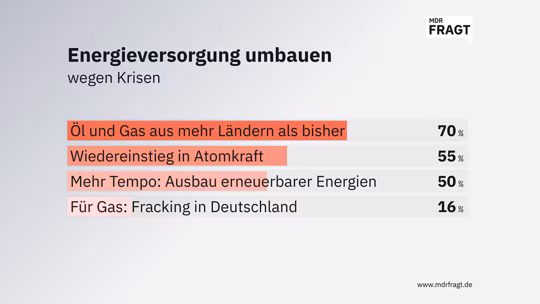Bildrechte: MITTELDEUTSCHER RUNDFUNKDer Vergleich der Altersgruppen zeigt bei der Frage nach einem Umsteuern bei der Energiepolitik deutliche Unterschiede: Befragte unter 30 Jahren wünschen sich vor allem mehr Tempo beim Ausbau erneuerbarer Energien. Bei den Teilnehmenden ab 30 Jahren steht dagegen die Forderung an erster Stelle, für Lieferungen von fossilen Rohstoffen auf mehr Quellen als bisher zu setzen.